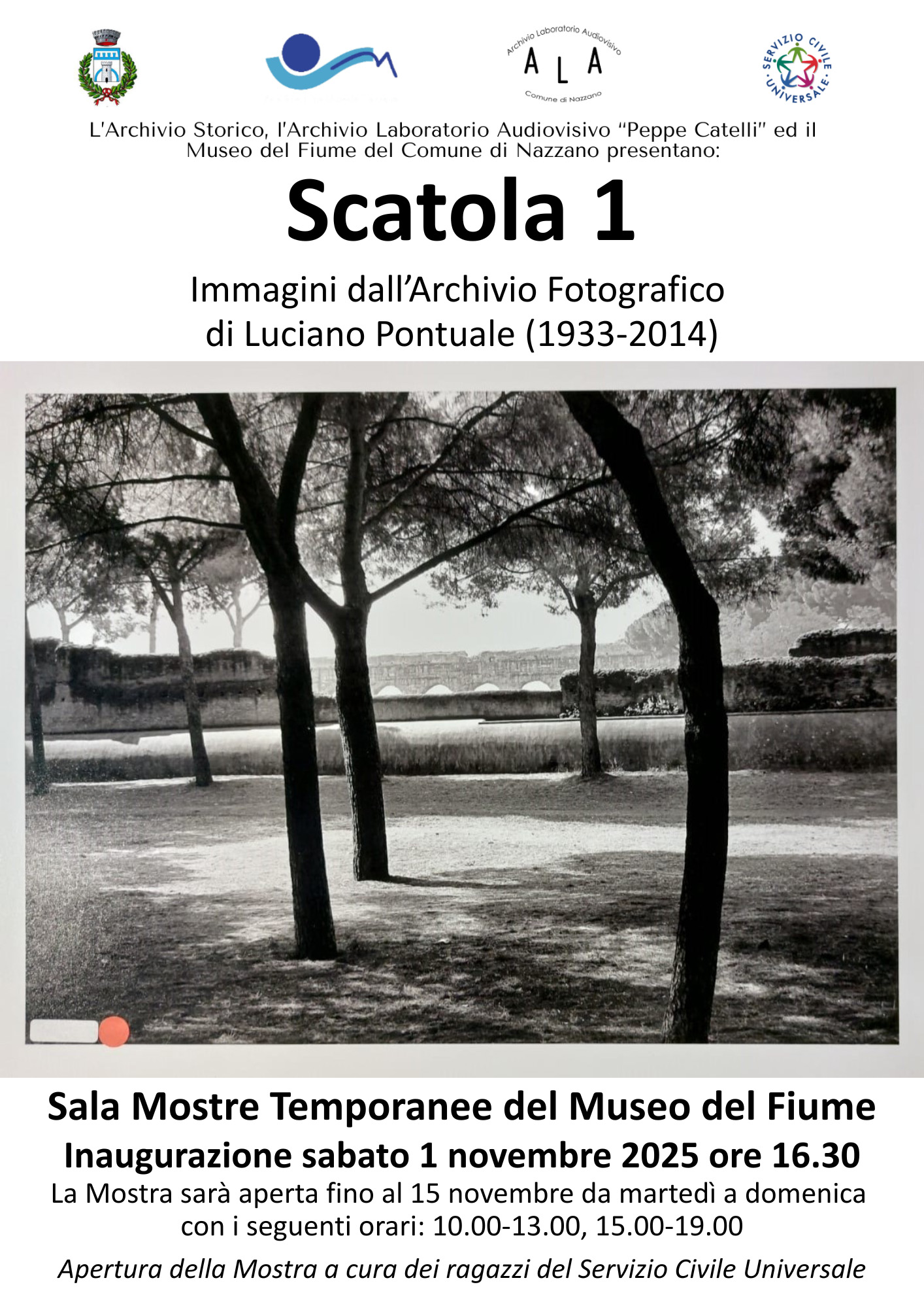 Il Museo del Fiume di Nazzano ospita dal 1° al 15 novembre 2025 la mostra fotografica “Scatola 1”, con immagini tratte dall’Archivio Fotografico di Luciano Pontuale, a cura dell’Archivio Storico e dell’Archivio Laboratorio Audiovisivo “Peppe Catelli”.